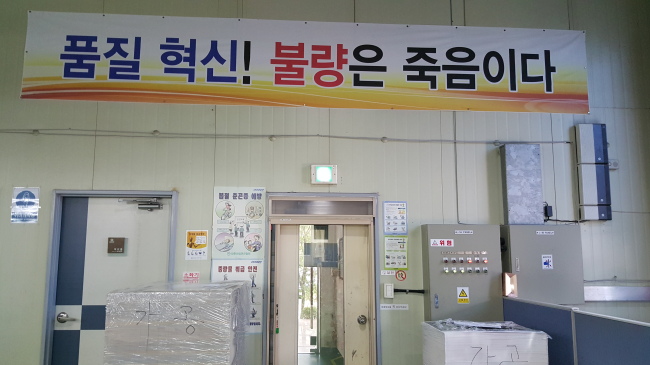붙은 ‘품질혁신! 불량은 죽음이다’는 현수막은 불량률 제로화에 대한 직원들의 결의가 담겨져 있다.