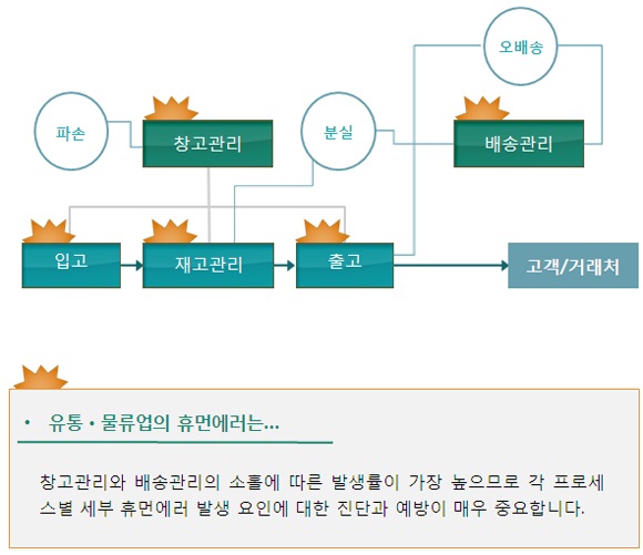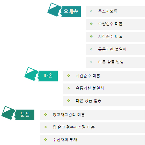 유통ㆍ물류업에서 주로 발생하는 휴먼에러에는 ‘오배송’, ‘파손’, ‘분실’등 3가지가 있으며 주요 발생 원인은 다음과 같습니다.