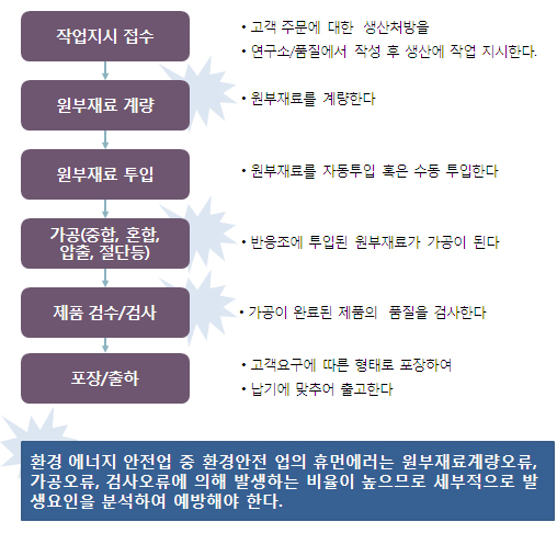 환경분야 중소기업은 주로 화학제품을 생산하는 업체들로 공정특성상 작업환경 관리가 매우 어렵고 휴먼에러 발생시 생산성과 품질에 직결되므로 작업자 숙련도가 중요하고 부산물발생에 의한 처리작업으로 작업자 작업부하가 많다.