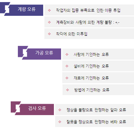 환경/에너지/안전 업에서 주로 발생하는 휴먼에러에는 ‘계량오류’, ‘가공오류’, ‘검사오류’등 3가지가 있으며, 또 각각 3가지, 4가지, 2가지의 유형으로 구분할 수 있다.