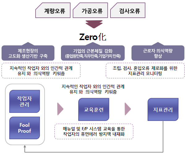 환경/에너지/안전 업에서 주로 발생하는 ‘계량오류’ ‘가공오류’ ‘검사오류‘ 가 가장 많이 발생합니다.이 휴먼에러를 방지하기 위해서는 제조현장, 품질검사, 원자재 완제품 창고 재고관리에 휴먼에러를 방지하는 Fool Proof 시스템 체계를 구축하여야 하며, 작업자와의 지속적인 의사소통 과 만족도를 고취시킬 수 있는 조직문화와 인사문화를 형성시켜주어야 하며, 체계적인 직무,기술,역량 교육을 통한 업무능력과 숙련도를 향상시켜 주어야 하며, 관리지표 (일일,주간,월간) 수립을 통한 경영성과를 모니터링 할 수 있는 지표관리 체계를 운영하여야 합니다.