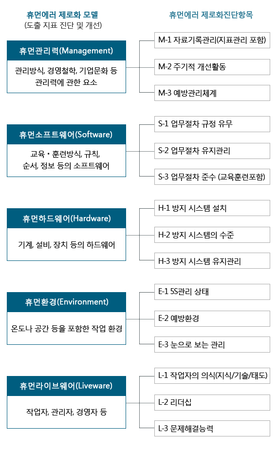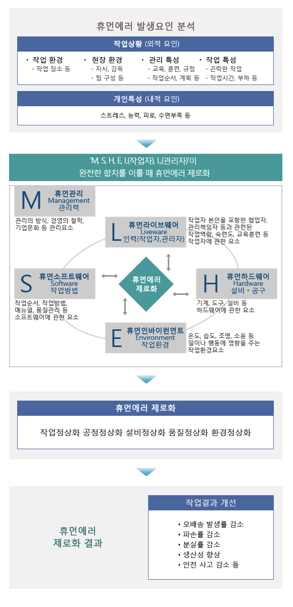 휴먼에러는 사람(작업자)을 중심으로 주위 작업요인(소프트웨어,하드웨어,작업환경,작업자, 관련자 등)과 관리력이 제대로 합치되어 있지 않은 곳에서 발생되므로 이들 요인(MSHELL)에 대한 총체적 정비를 통해 휴먼에러 제로화를 통한 기업의 생산성을 향상시킬 수 있습니다.