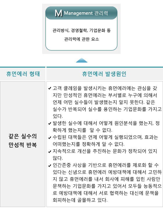휴먼에러는 사람과 사람을 둘러싸고 있는 여러 가지 요인에 의해 발생하게 되는데, 예를 들어 휴먼에러의 발생과 원인분석과 대책시행과 성과검증등에 기록관리가 철저하지 않고, 개선을 지속적으로 추진하지 않고, 휴먼에러의 예방철학을 가지고 예방대책을 수립하지 않으면, 같은 실수를 만성적으로 계속 반복하게 된다. 이를 관리력(M) 요인으로 구분할 수 있습니다.