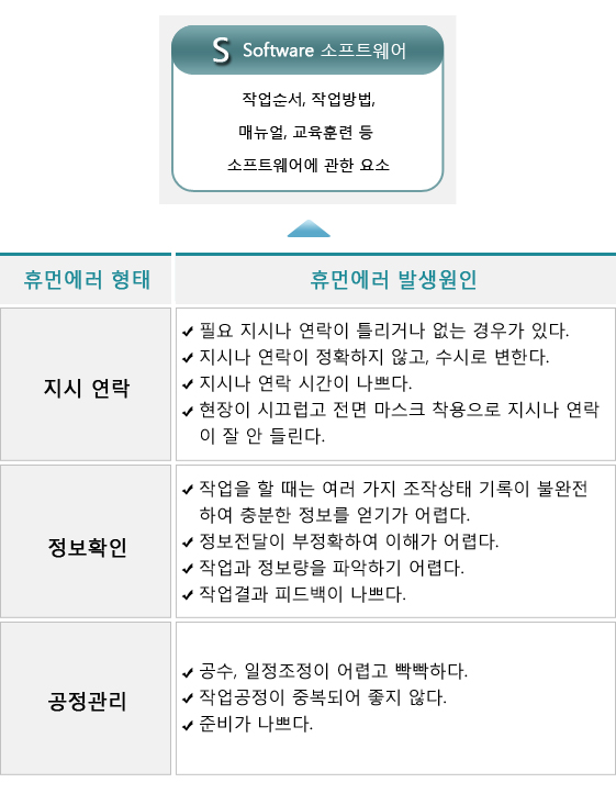 휴먼에러는 사람과 사람을 둘러싸고 있는 여러 가지 요인에 의해 발생하게 되는데, 예를 들어 읽기 어려운 취급설명서, 불충분한 작업 순서표, 교육훈련 불충분 등의 상황에서는 누구나 휴먼에러를 범할 가능성이 높아진다. 이를 소프트웨어(S) 요인으로 구분할 수 있습니다.