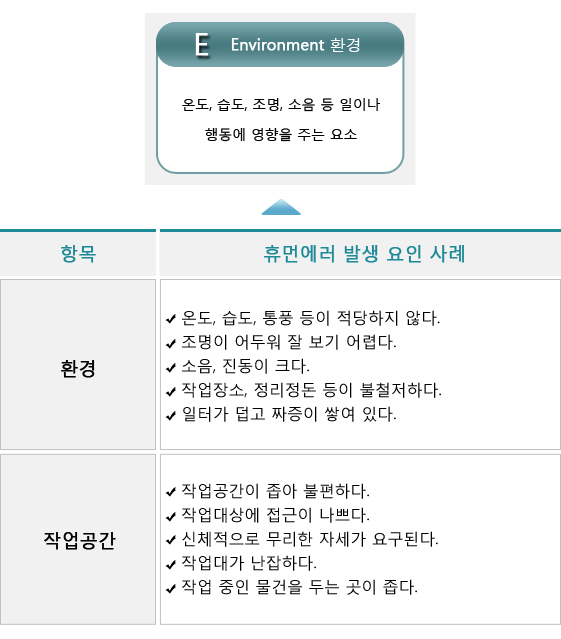 휴먼에러는 사람과 사람을 둘러싸고 있는 여러 가지 요인에 의해 발생하게 되는데, 예를 들어 어둡고 무더운 작업환경, 난잡한 작업대, 비좁은 작업공간 등의 상황에서는 누구나 휴먼에러를 범할 가능성이 높아진다. 이를 작업환경(E) 요인으로 구분할 수 있습니다.