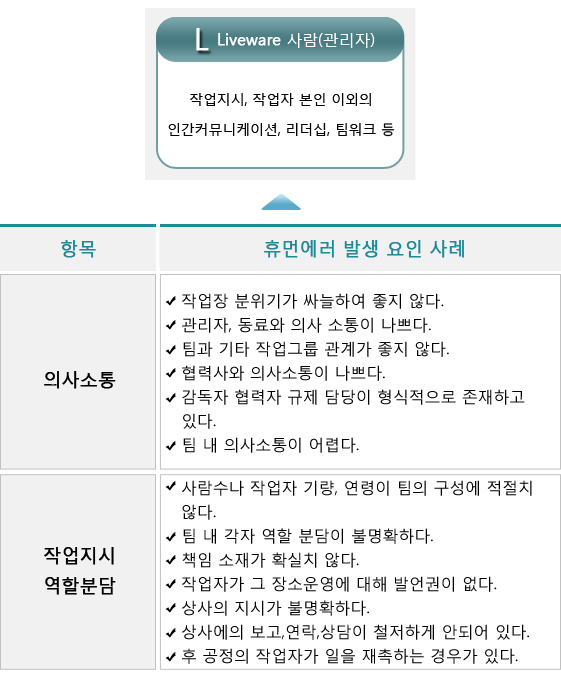 휴먼에러는 사람과 사람을 둘러싸고 있는 여러 가지 요인에 의해 발생하게 되는데, 예를 들어 관리자들의 의사소통 오류, 지시 불명확, 보고/연락/상담의 불충분 등의 상황에서는 누구나 휴먼에러를 범할 가능성이 높아진다. 이를 관리자(L) 요인으로 구분할 수 있습니다.